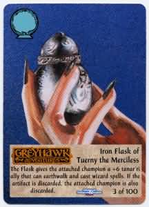 When Brian BLume was bent on devising a load of artifacts he made up such items as that of Kas and Gax for Tim and me. Inspired thus, I ccreated the Iron FLask of Tourney the Merciless in honor of sone Ernie and his evil PC, Erac's Cousin.
