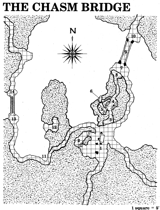 been traveling in suddenly turns east, and a cool, misty draft blows into your face. A few feet beyond the turn, you break out of the passage onto a ledge overlooking a vast and deep chasm. Through the dimness, you see the faint outline of a bridge about 50' south. The bridge spans the gap between the 2 ledges, and on the southernmost of these ledges you can see several shadowy figures. Your choice of movement is fairly