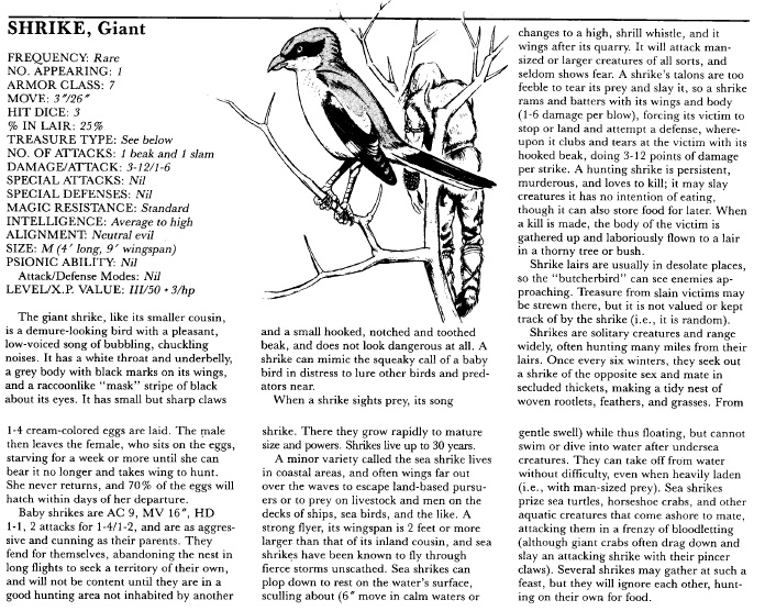 hooked beak, doing 3-12 points of damage